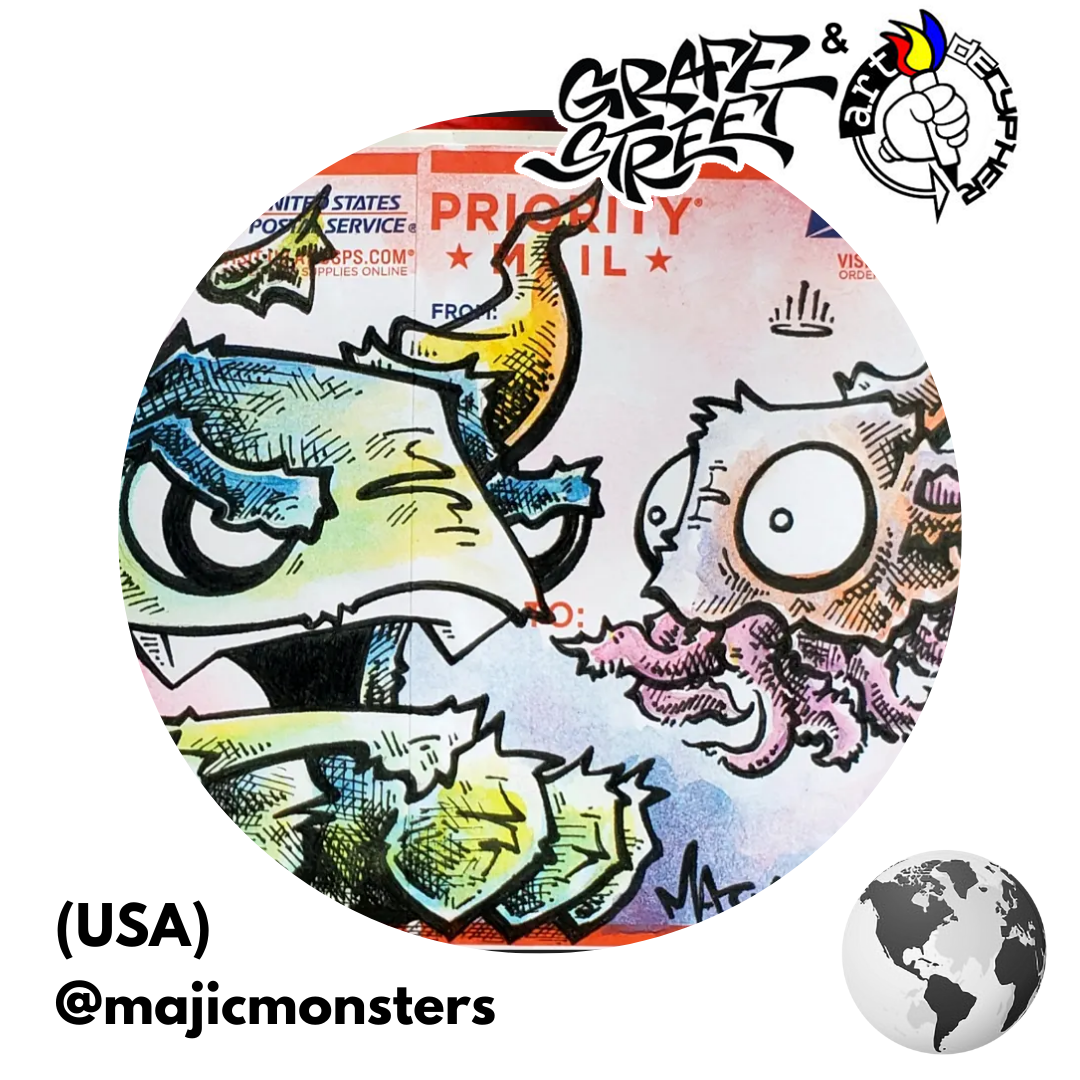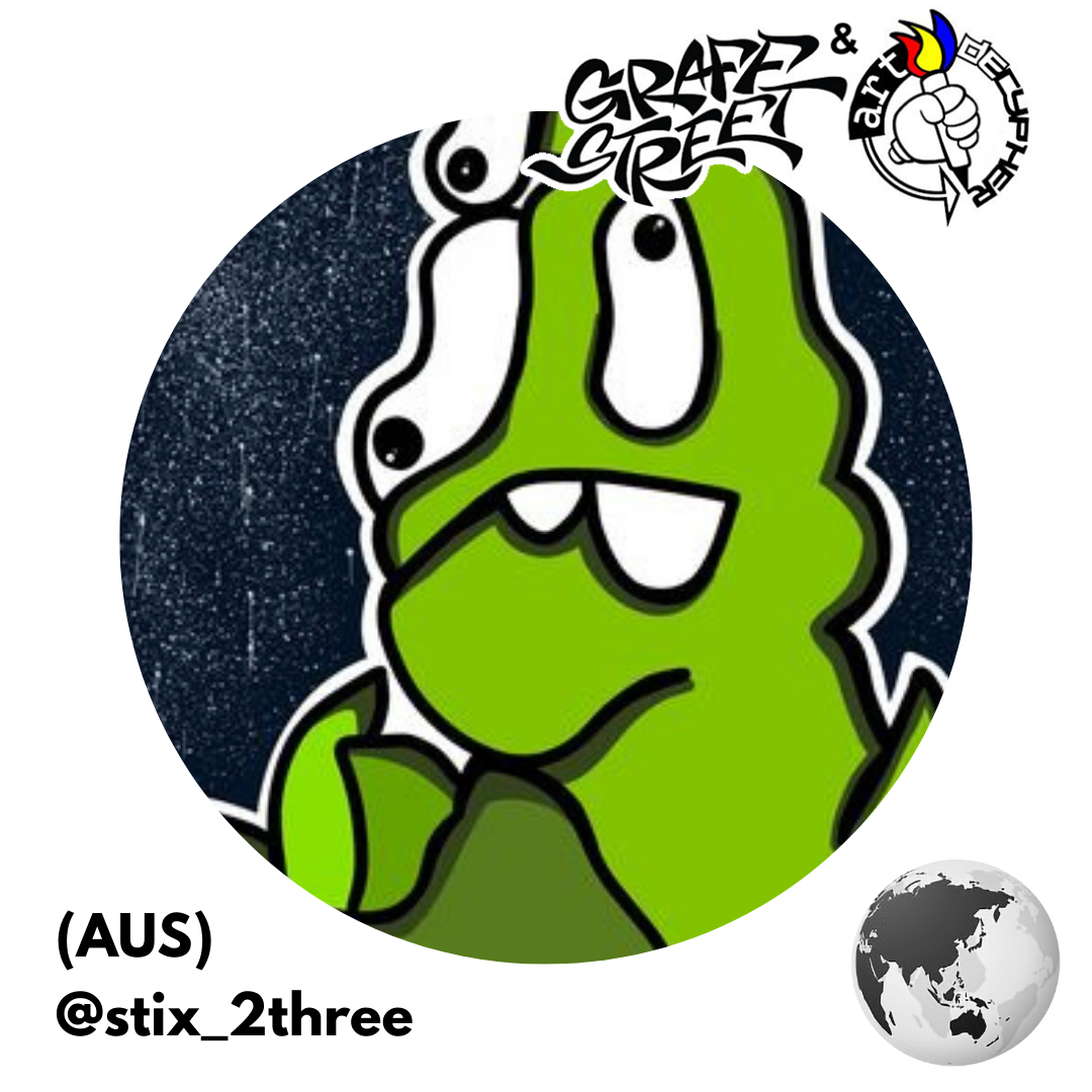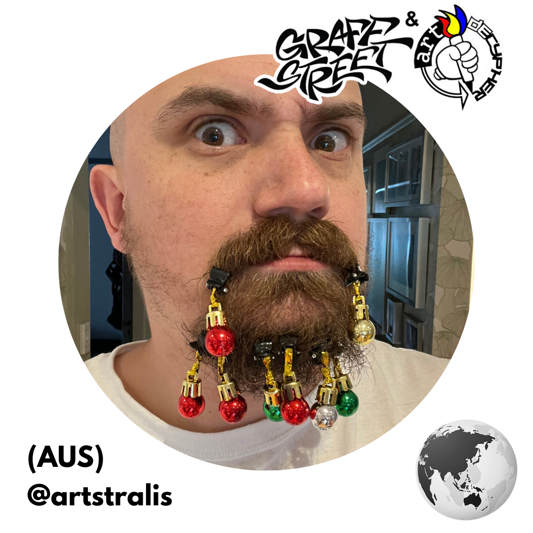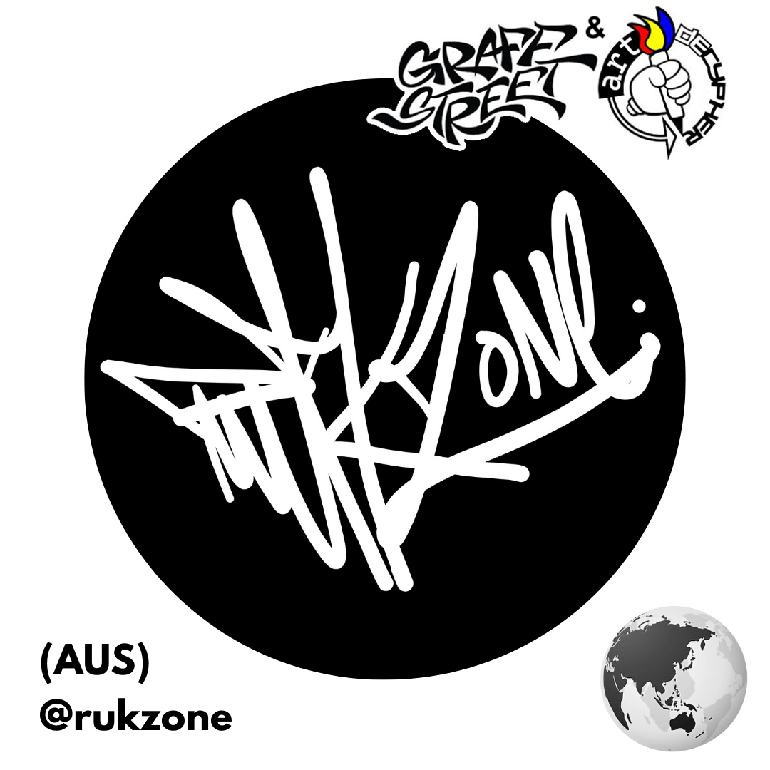 Rukz One was born and raised in the Western Suburbs of Melbourne, Australia. Often described as unique and polarising, he (and his art) swings between the simple and the complex. His art draws inspiration from skateboarding, hip-hop, the Melbourne street art/graffiti culture, and humanity. Now focused on the Artdecypher banner he aims to shine a creative light that reaches new locations and audiences by paving new paths that challenge the “norm”. Community and collaboration are driving forces in his work.