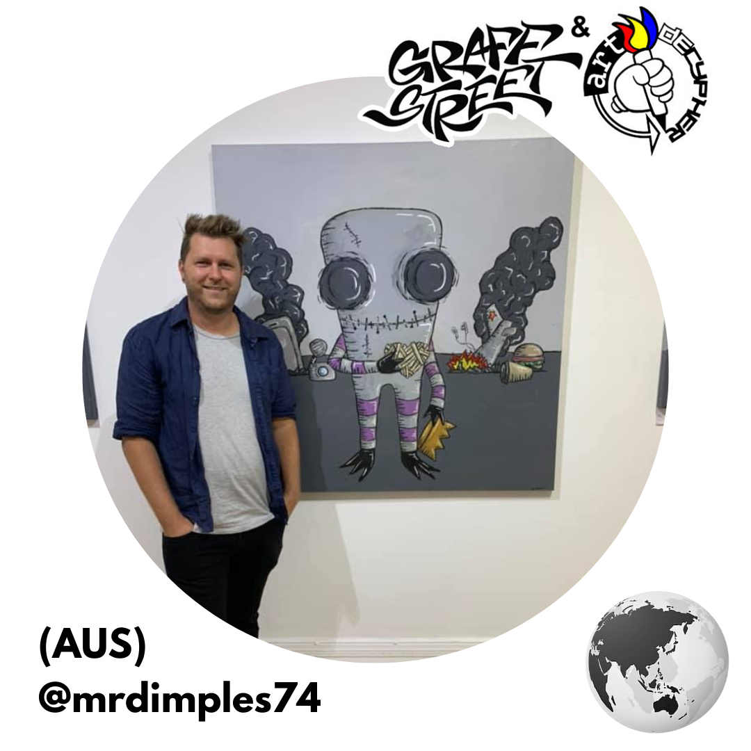 Mr Dimples’ is a Bendigo street artist primarily working with paste ups and stencils. His art has always come from an emotional experience, weather happy, angry or frustrated. Mr Dimples was born, one night in 2012, where the artist had a few scary experiences of an intruder hanging around his house, causing many sleepless nights. He used art has an emotional response inspired by the frustrations of his life, such as friendship, work, social media/technology and dating. Using his distinctive style and iconic characters, each canvas tells a story of events or people in the artist’s life.