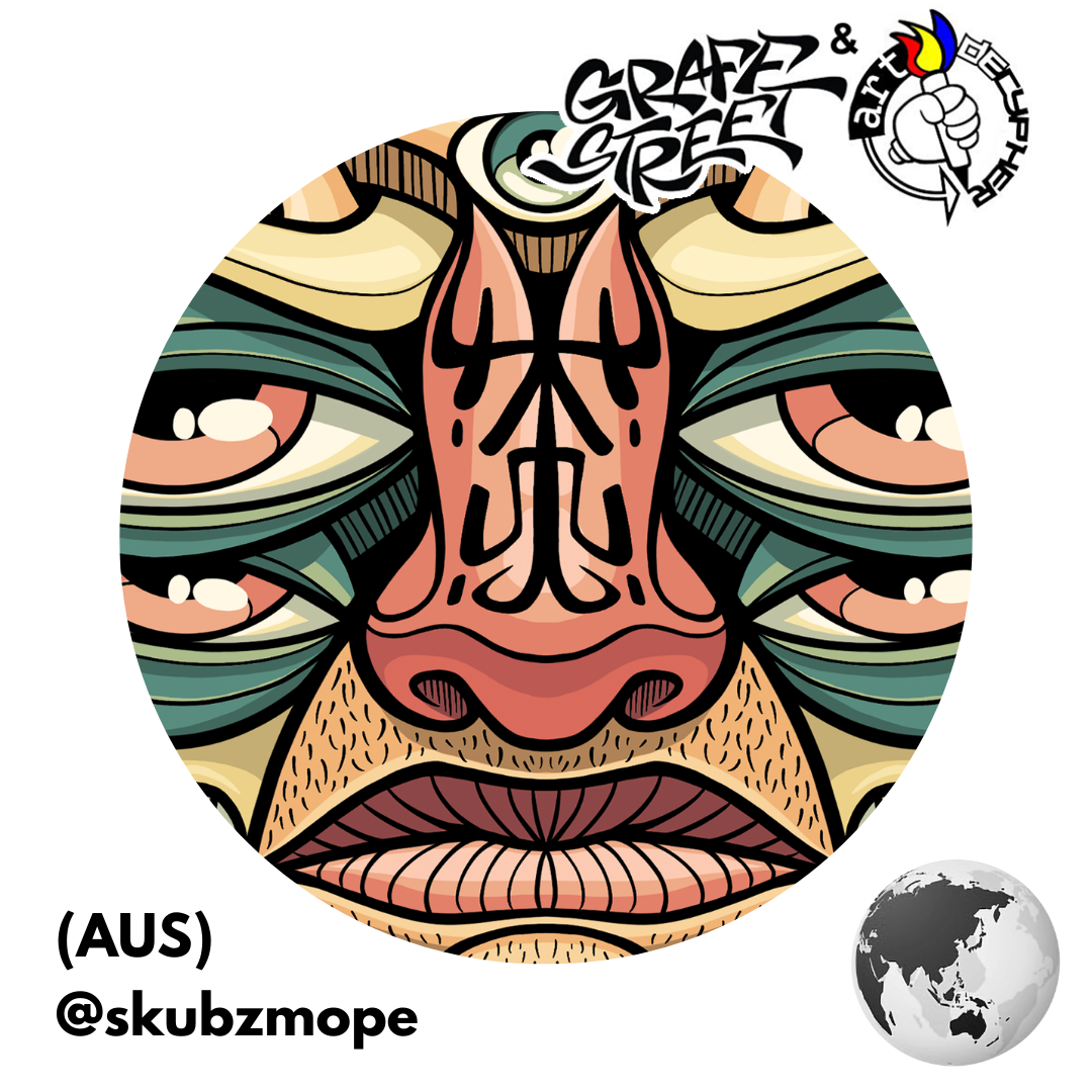 Working predominantly in acrylic, aerosol and digital mediums, Skübz artwork is informed by a blend of visual influences including Totem Poles from the Indigenous Peoples of the Pacific Northwest, Animation, Comics, Graffiti, Portraiture and Abstraction.
