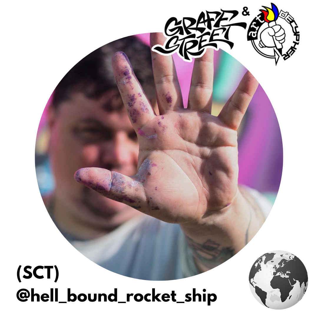 My name is Hellboundrocketship/ HellBound I am a Scottish illustrator/street artist My style is inspired by anime, manga and cartoons as well as music and skateboard graphics. I mostly work within digital art but I also use spray paint and acrylics for painting as well as experimenting with other mediums from time to time