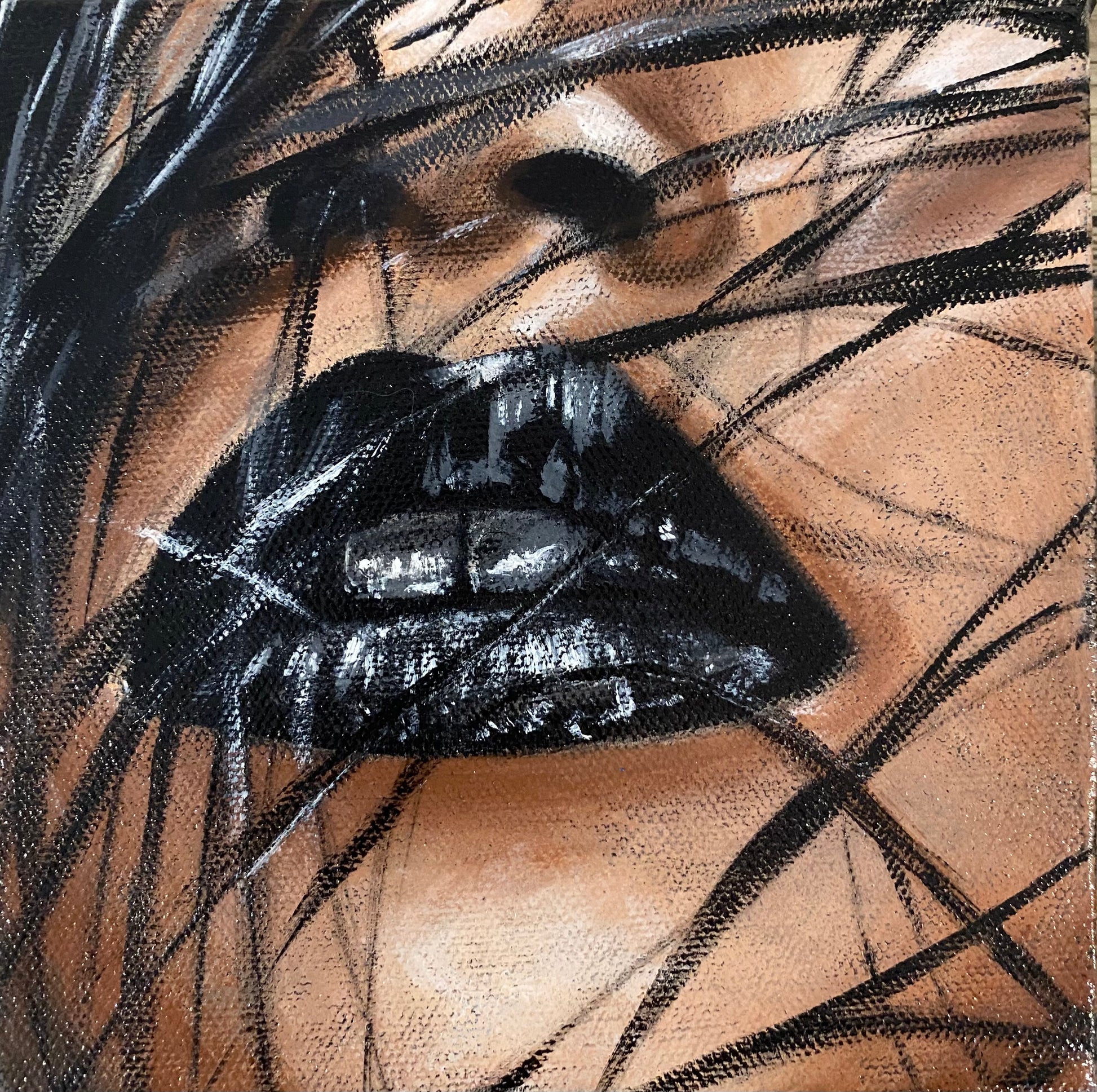 Artwork Description: I"This painting confronts stereotypes of beauty and femininity with unapologetic boldness. Featuring glossy black lips emerging from tangled strands of hair, the work speaks to defiance, allure, and mystery. The sensual focus on the mouth and fragmented facial contours evoke themes of identity, power, and self-expression. The use of rich blacks against a warm, flesh-toned backdrop challenges the notion of black as a “basic” colour, asserting instead its elegance and strength. This piece is both a celebration and a reclamation of the dark and the divine.