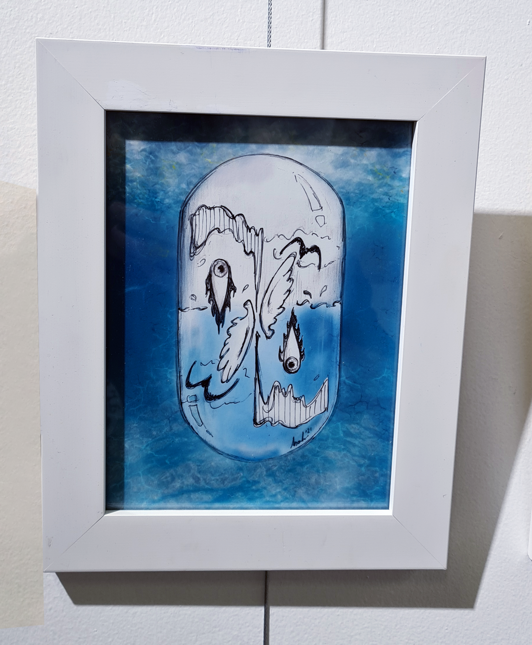Artwork/Artist Description: "Dreaming Pill" is a surreal digital artwork born from a playful pen and pencil doodle. The composition centers around a capsule-like motif, exuding an otherworldly aura. Encircled by a serene and tranquil ocean, the pill seems to float weightlessly, invoking a sense of calm and introspection. The juxtaposition of the capsule and the peaceful expanse of the ocean invites contemplation on the boundaries between reality and imagination and beckons viewers to explore their subconscious realms.
