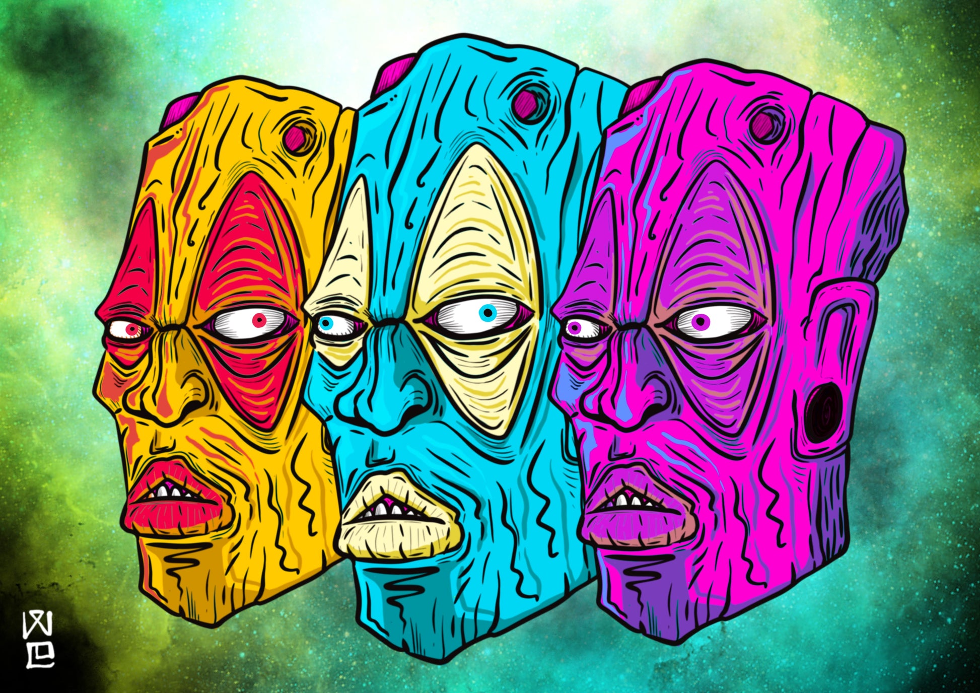 Artwork Description: 3 Polynesian itoros (idols) gone rogue: changed skin colour, got tattoos and piercings and now floating in space….does not make any sense at all.