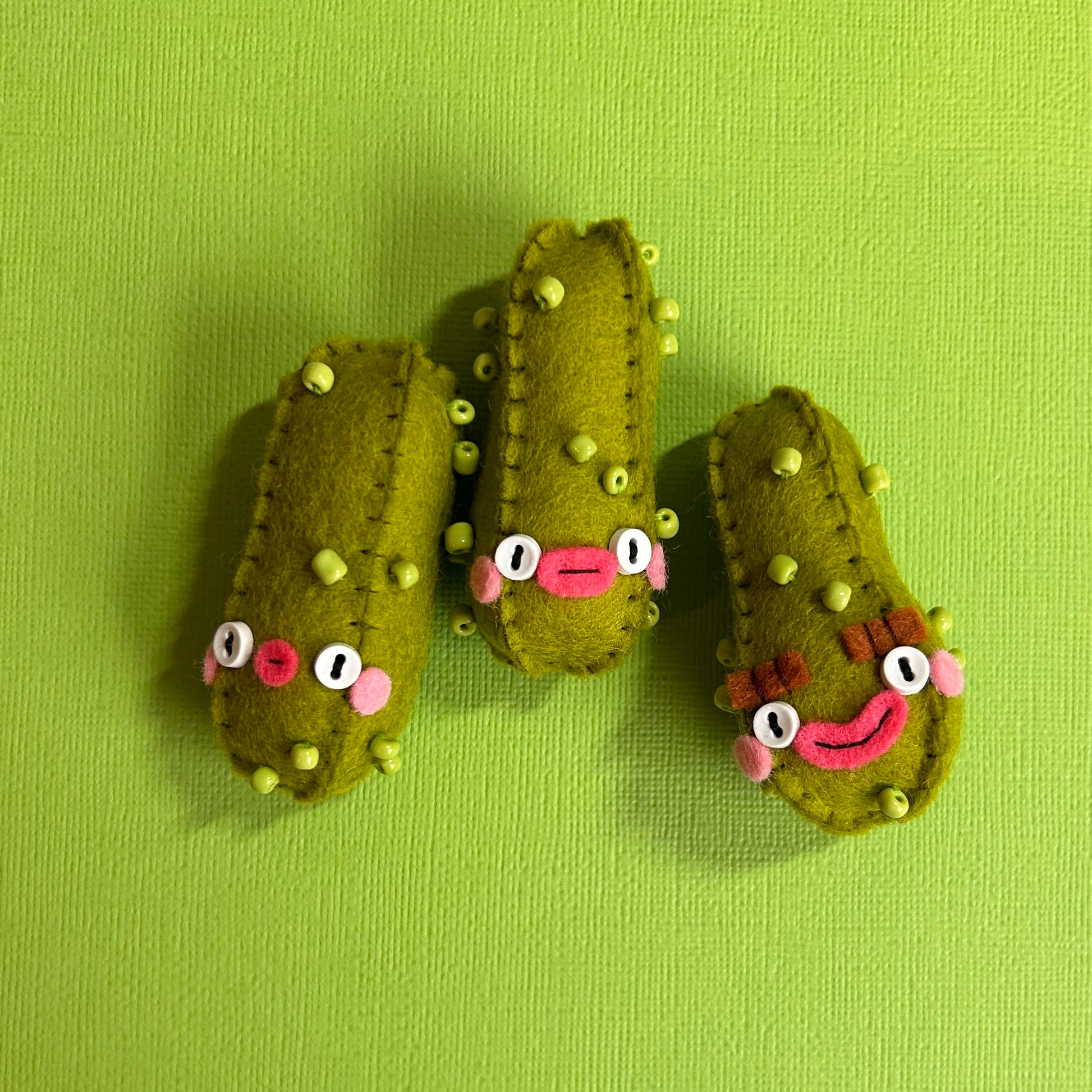 Artwork/Artist Description: Dive into a pickle paradise with this hand-made box of pickles! Perfectly strange, each pickle is unique and sure to bring a smile to any pickle lover. Get your snack on with this one-of-a-kind collection!