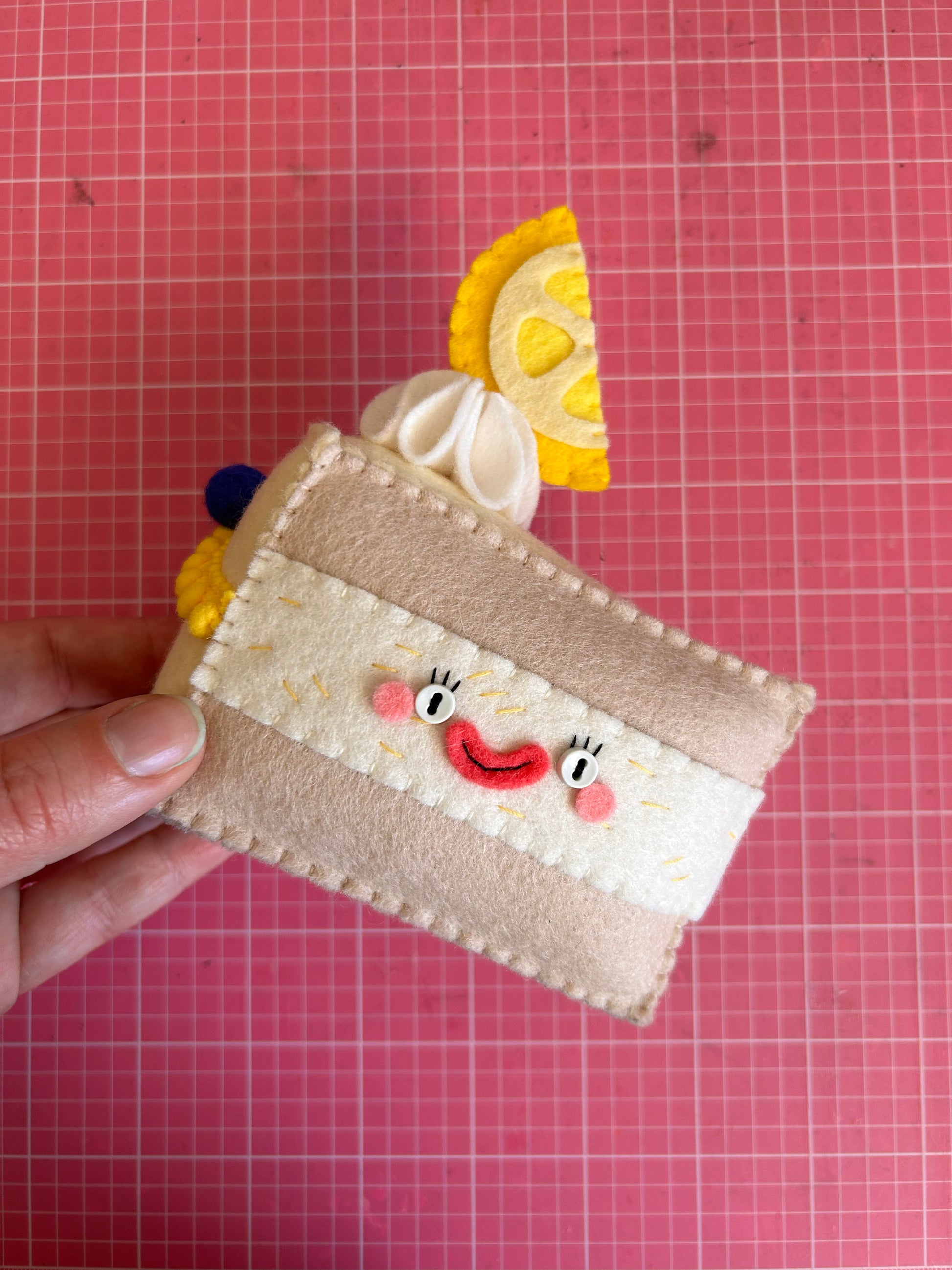 Artwork/Artist Description: Indulge in some sweetness with this handmade, wool-felt Lemon and Blueberry Cake! Cuddly and full of zesty flavor, this plush toy is perfect for foodies who can't get enough of zingy citrus and delicious berries.