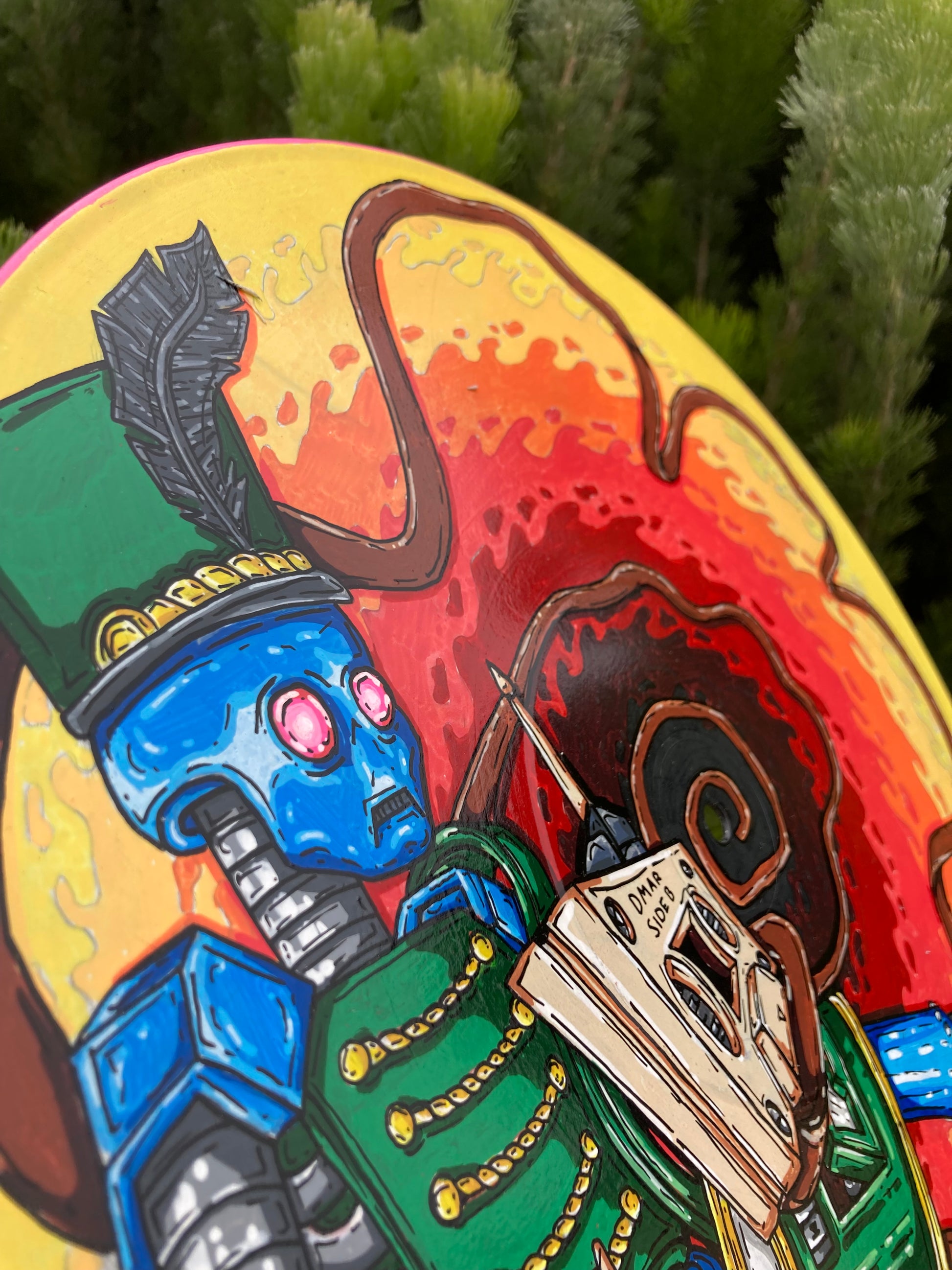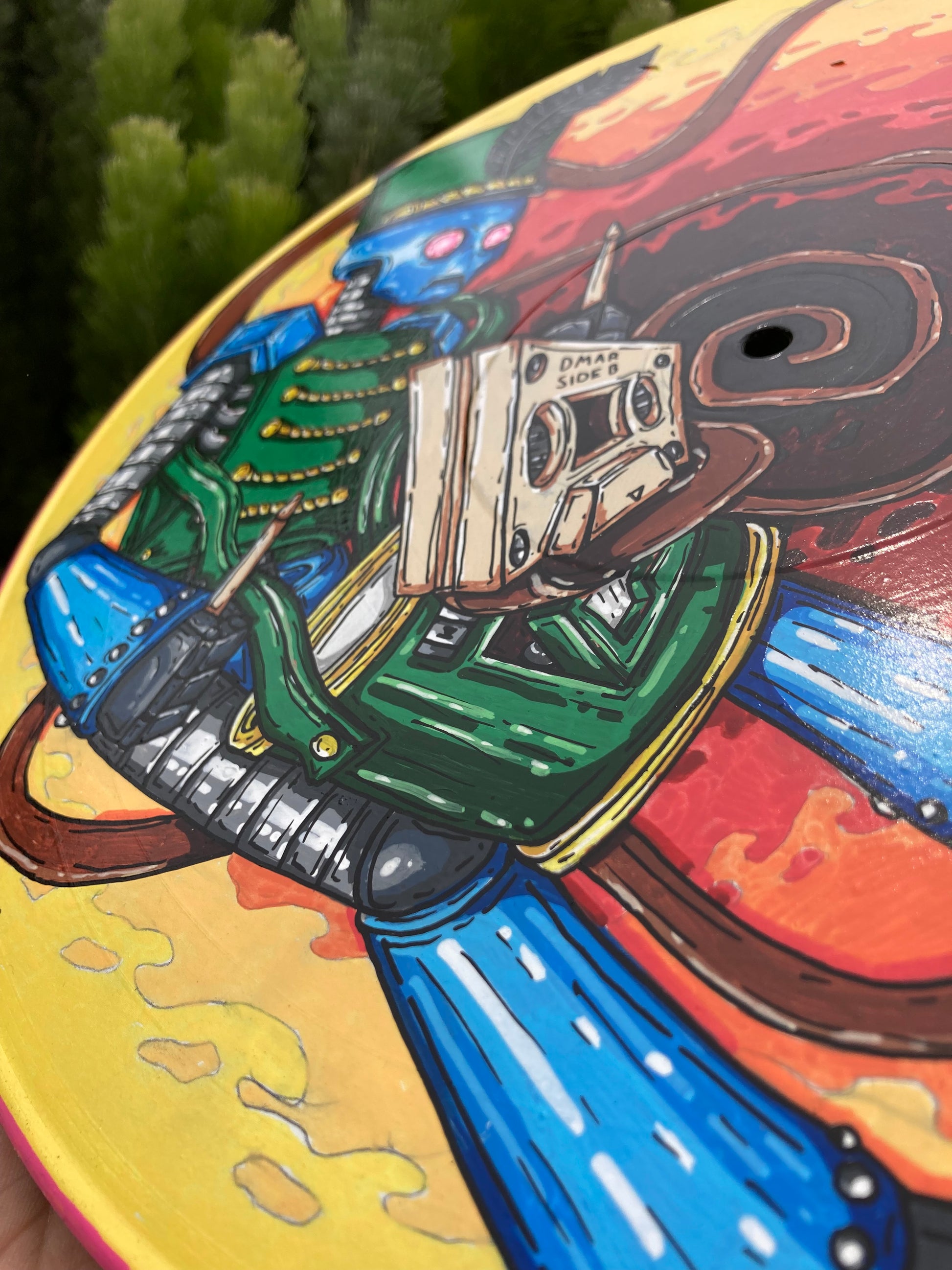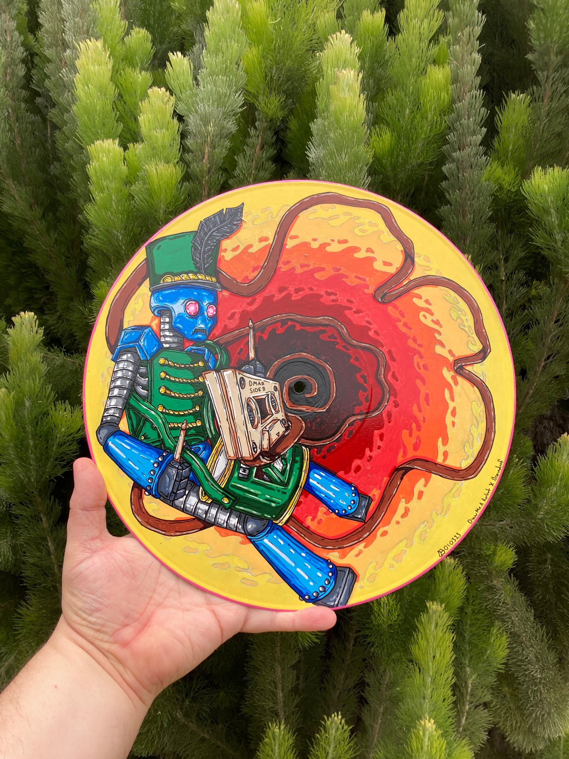 Artwork Description: 12” record depicting a marching band / drumming robot, along with a swirling cassette tape ribbon