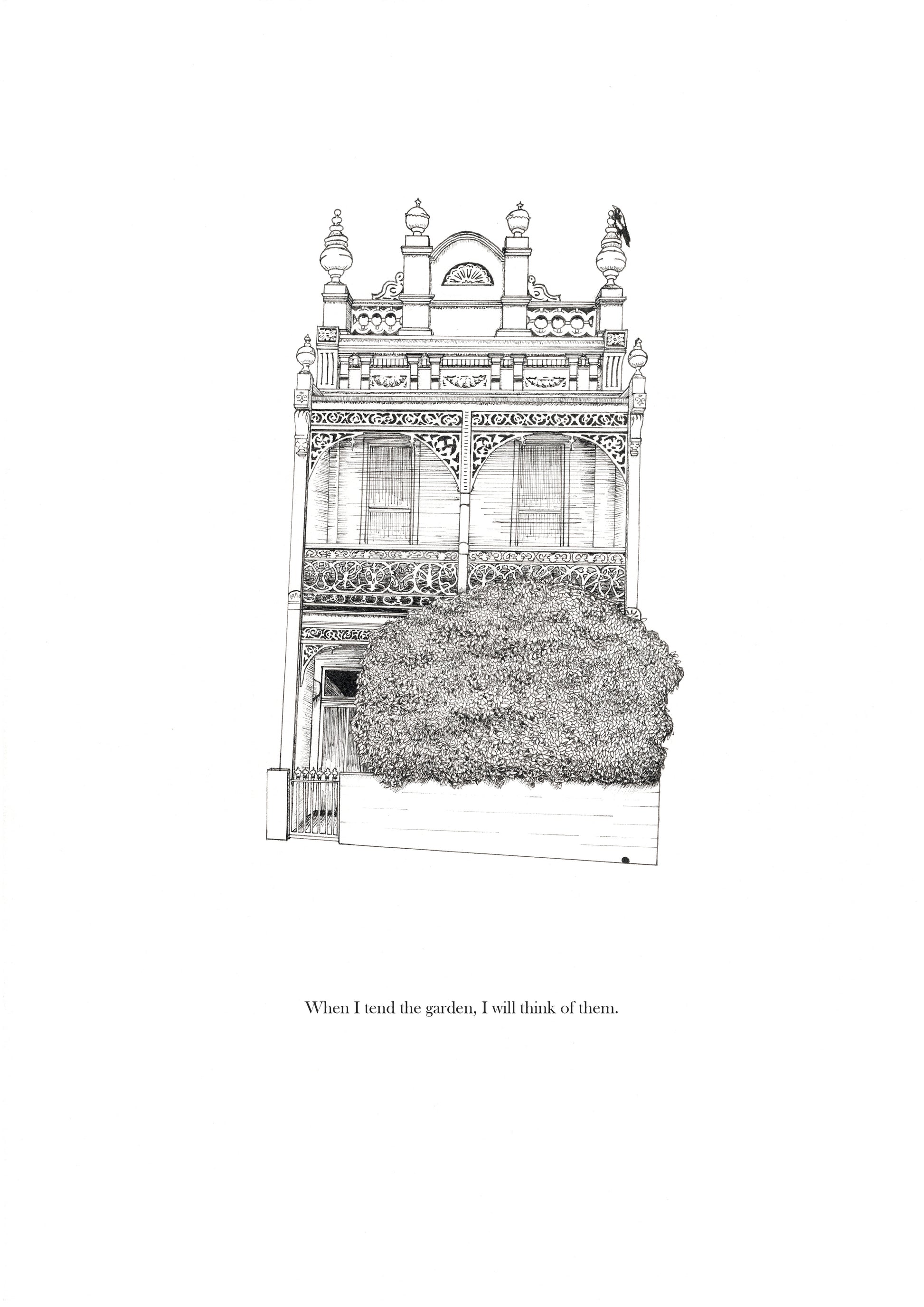 Artwork Description: A Victorian home with a magpie on the roof. The lyric is from the song "tend the garden" by Gang Of Youths.