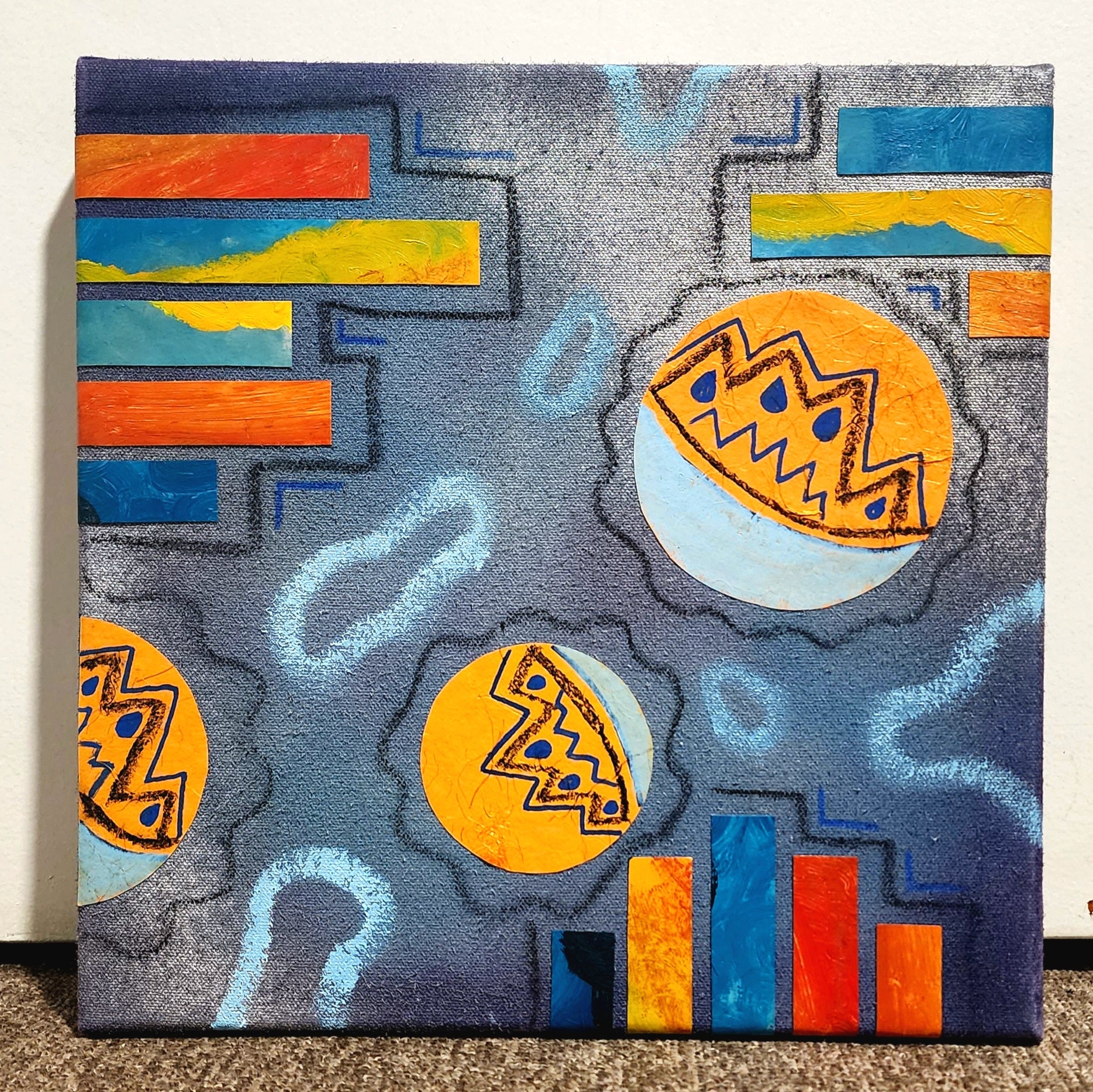 This mixed media piece is a made using a textured spray paint background, handmade paper, acrylic paint and oil pastels.
