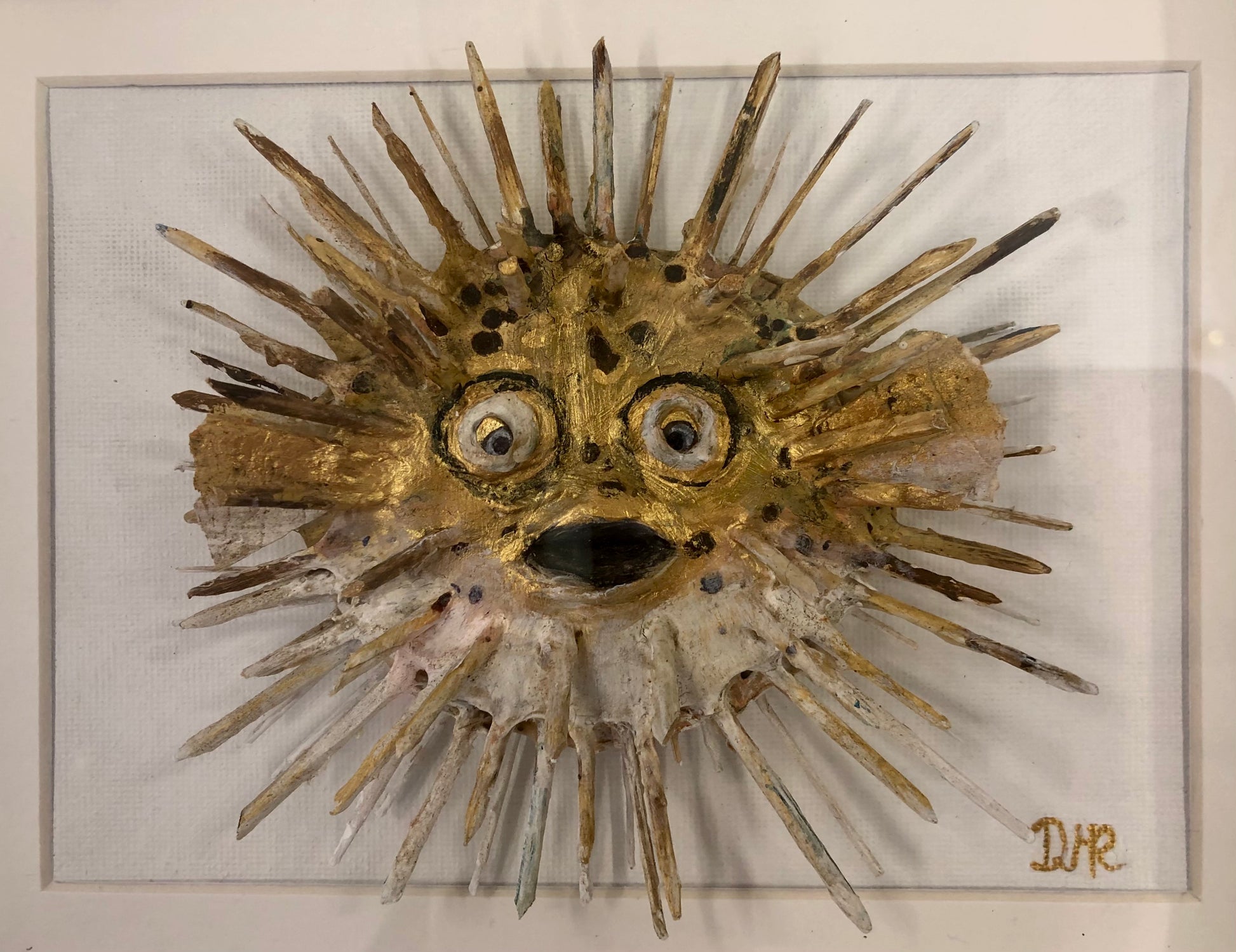 Artwork/Artist Description: Puffa - After a cook up in Sorrento many years ago, there was several sticks soaked in lemon juice left over after a bbq. So after drying them I began thinking about their re-use. A puffer fish seemed the most likely and interesting idea so a combination of foam, bamboo and acrylic paint. I made this over twenty years ago I found this one hard to let go of but here we are it looks just as fresh as the day it was made. Natural wood, clean white paint with a hint of glamorous gold. A bit of fun!