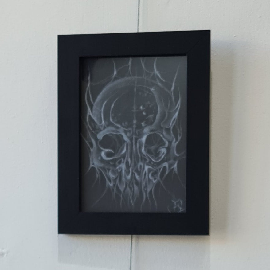 Artwork Description: Dark artist and tattooist from the western suburbs. My work presents a balance of chaos and beauty, with a heavy focus on gothic subject matter. Serving an A5 sketch of a skull, white pencil on black paper
