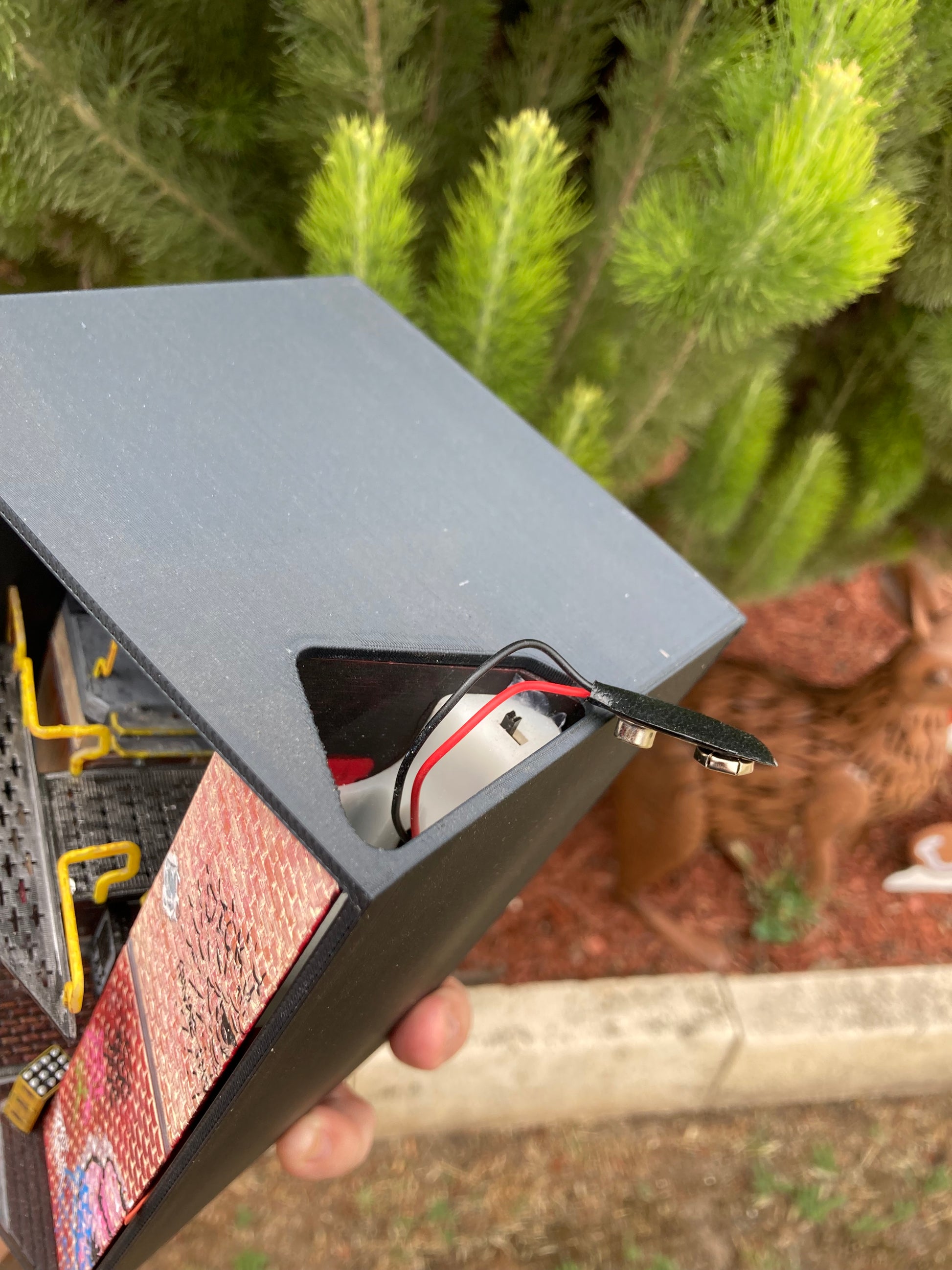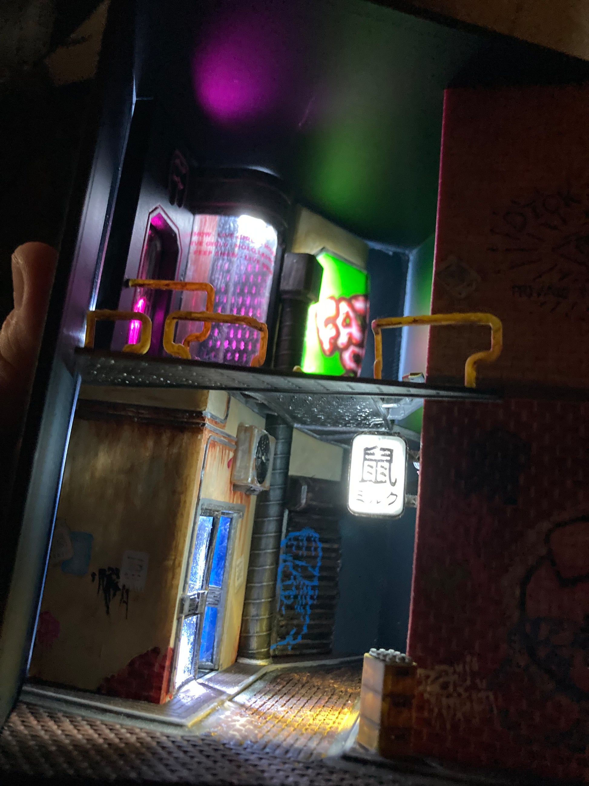 Artwork Description: Diorama for The Creative S3 card #25. Depicting a cyberpunk alleyway. Battery (9v) powered light, access via top with switch.